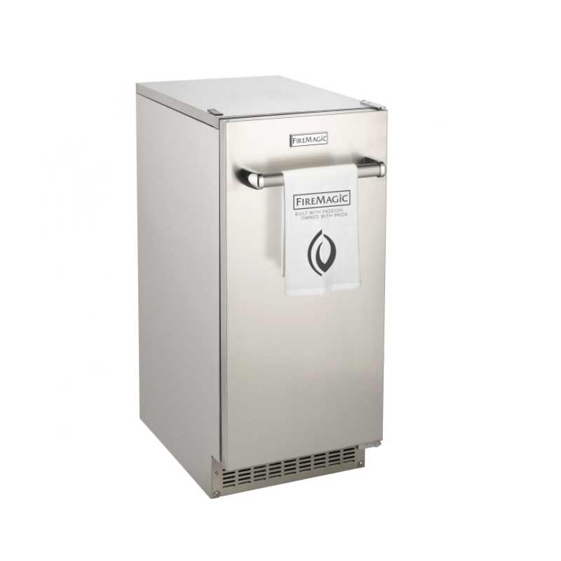 Outdoor rated ice maker produces 63lbs of ice in a 24 hr. period. Capable of storing up to 27lbs of individual clear ice cubes. UL listed for outdoor use. Continuously produces ice on demand as ice used. Suitable for outdoor or indoor applications. Reversible door feature horizontal handle that doubles as a Towel Bar.