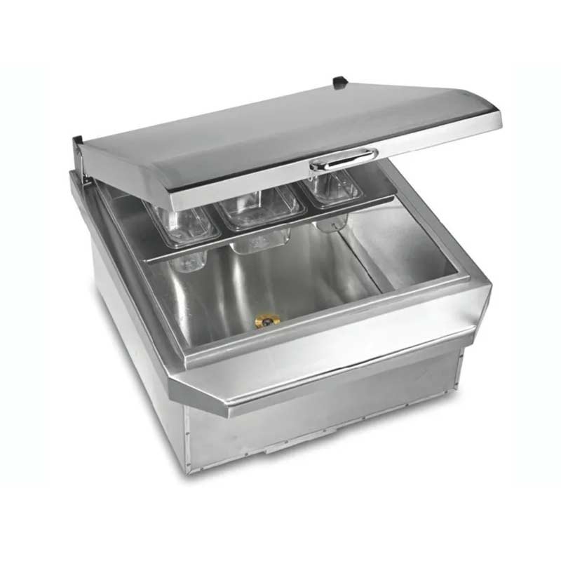 This premium, party-ready drop-in cooler accommodates up to 60 bottles and 25 pounds of ice. The insulated bin and gasket-sealed lid keep contents ice-cold into the wee hours. Sleek, geometrical design shows off our signature polished accents and seamless welds.- Removable/sliding condiment tray